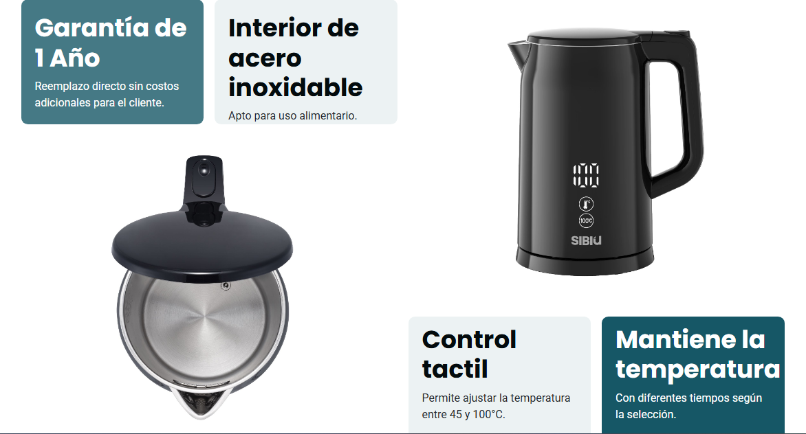 Diseñada para quienes buscan practicidad y eficiencia. Su interior de acero inoxidable garantiza durabilidad y seguridad en cada uso. Con control de temperatura ajustable y pantalla intuitiva, permite seleccionar el nivel ideal para cada infusión con precisión y facilidad.